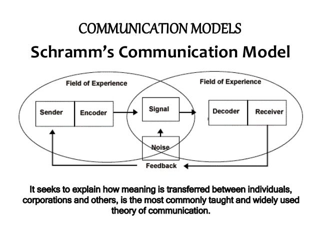 This model is the simplest models to understand the workings of the communication process. The Osgood-Schramm model is built on the theory that communication is a two-way street, with a sender and a receiver. National upbringing even relational background (relationships).